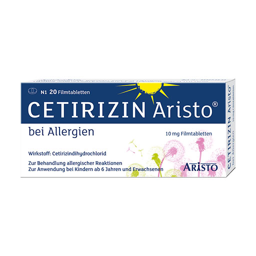 Cetirizin Aristo® bei Allergien ist ein rezeptfreies Antiallergikum mit dem Wirkstoff Cetirizindihydrochlorid. Es wird bei Kindern ab einem Alter von 6 Jahren und Erwachsenen zur Linderung von Nasen- und Augensymptomen bei saisonaler und ganzjähriger allergischen Erkrankungen wie allergischem Schnupfen (Rhinitis) und Nesselsucht (Urtikaria) eingesetzt.