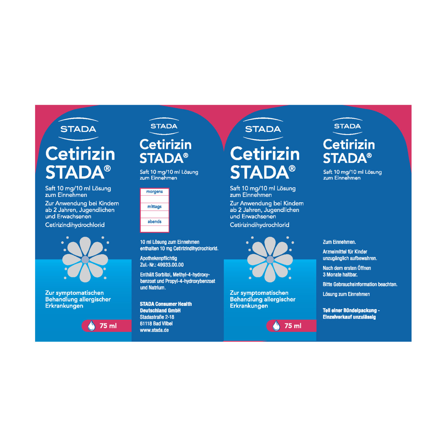 Cetirizin STADA® Saft 10 mg/10 ml Lösung zum Einnehmen ist ein schnell wirksames Antihistaminikum. Wirksam gegen Allergien, hilft es nicht nur zuverlässig, sondern auch schnell. Bereits 20 Minuten nach Einnahme ist in der Regel seine antiallergische Wirkung spürbar, die sich über 24 Stunden hält.