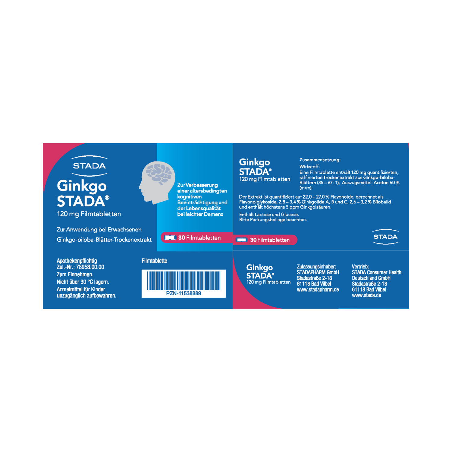 Anwendungsgebiete: Ginkgo STADA® ist ein pflanzliches Arzneimittel zur Verbesserung einer altersbedingten kognitiven Beeinträchtigung und der Lebensqualität bei leichter Demenz. Enthält Lactose und Glucose.