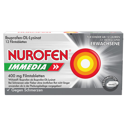Nurofen Immedia Filmtabletten enthalten den Wirkstoff Ibuprofen als Ibuprofen-DL-Lysinat. Durch Kombination mit der Aminosäure Lysin ist Ibuprofen besonders gut löslich, wird sehr schnell vom Körper aufgenommen und gelangt so schneller an den Ort der Schmerzentstehung. Das macht es zum idealen Schmerzmittel für Patienten, die eine besonders schnelle Schmerzlinderung suchen.