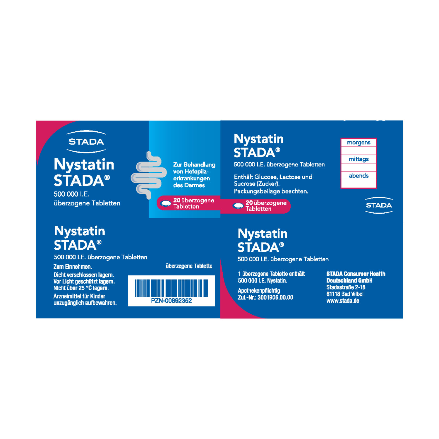 Der Wirkstoff von Nystatin STADA® ist Nystatin. Eine überzogene Tablette enthält 500.000 I. E. (Internationale Einheiten) des Wirkstoffs. Nystatin unterstützt den Körper dabei, Pilze aus der Candida-Gruppe zu bekämpfen, indem der Wirkstoff die Zellwandstruktur zerstört. Das Nystatin bildet Poren und macht die Zellwand somit durchlässig. In der Folge ist der Stoffwechsel der Pilz-Zelle behindert und sie stirbt ab.