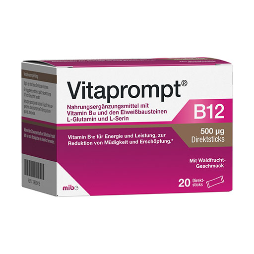 Egal ob im Job oder im Privatleben – unser moderner Alltag kostet uns oft jede Menge Energie. Ermüdungserscheinungen sind da keine Seltenheit. Vitaprompt® B12 500 μg Direktsticks füllt die Speicher auf und bringt den Energiestoffwechsel in Schwung. Zusätzlich enthält das Nahrungsergänzungsmittel ausgewählte Eiweißbausteine. Besonders praktisch: Das Direktgranulat kann ohne Wasser eingenommen werden. Auch für Veganer geeignet!